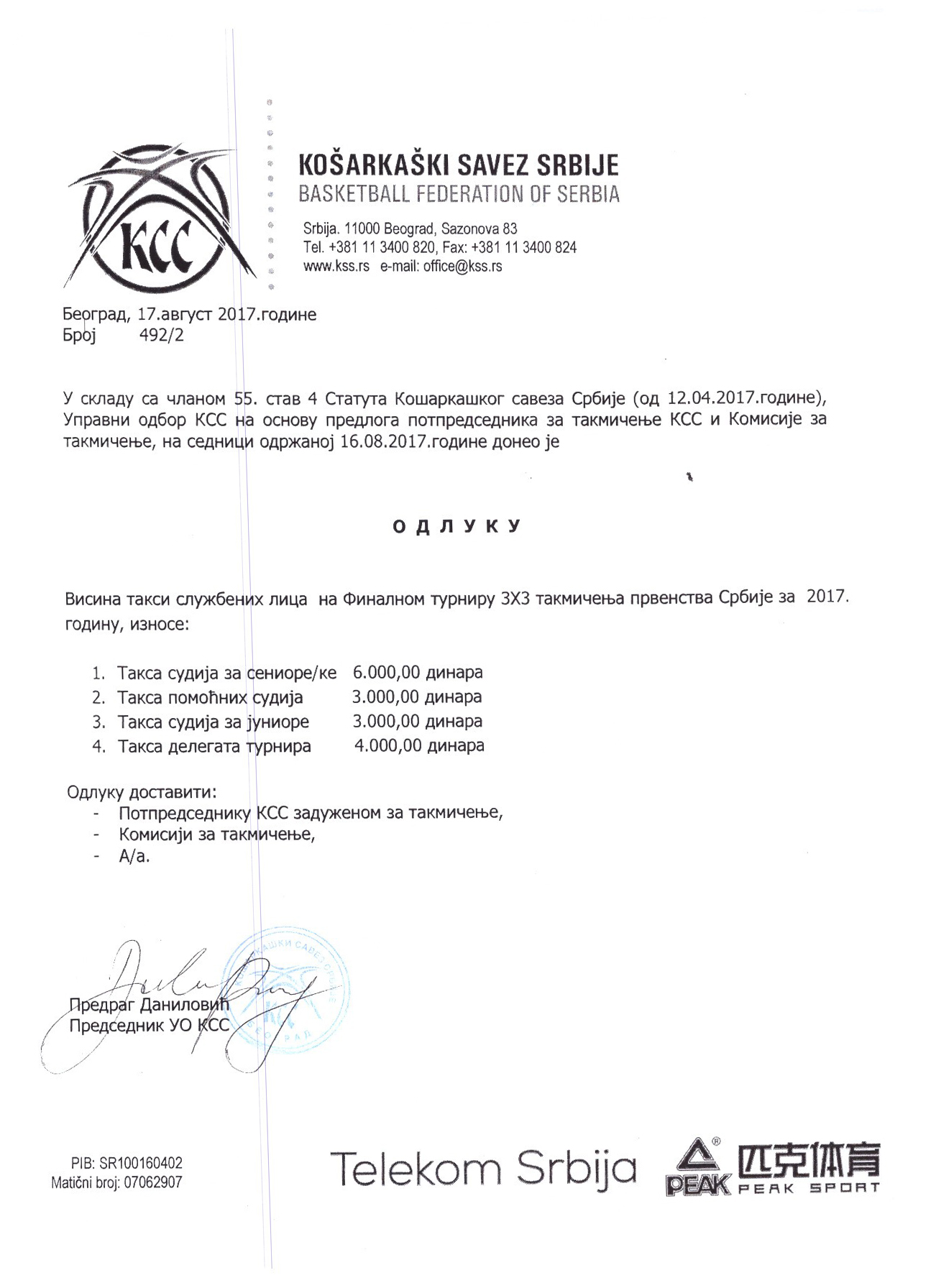 Takmičarska komisija KSS je dostavila Odluke UO KSS sa sednice koja je održana 17. avgusta 2017. godine u Beogradu. Odluke su u prilogu.