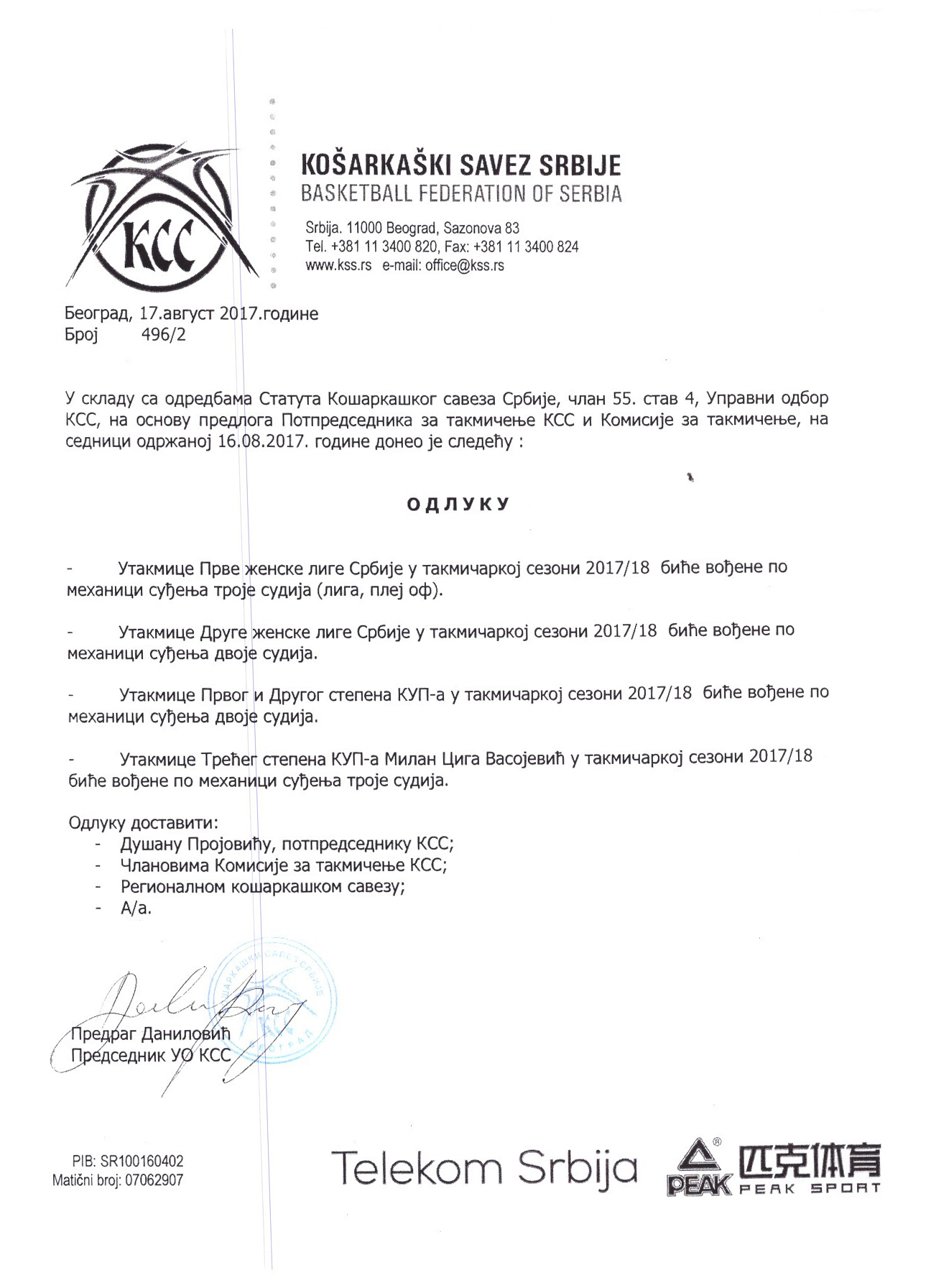 Takmičarska komisija KSS je dostavila Odluke UO KSS sa sednice koja je održana 17. avgusta 2017. godine u Beogradu. Odluke su u prilogu.